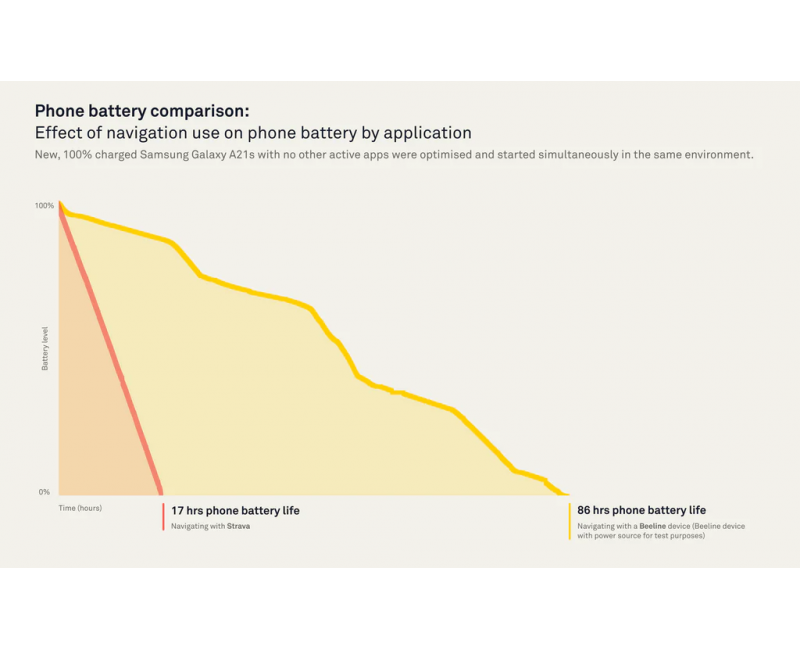 Zużycie baterii telefonu na aplikacji BEELINE jest ponad 5 krotnie niższe niż w przypadku gdy telefon działa na aplikacji map GOOGLE lub innej podobnej np. STRAVA.